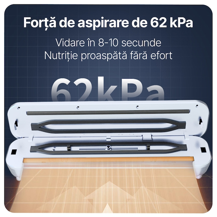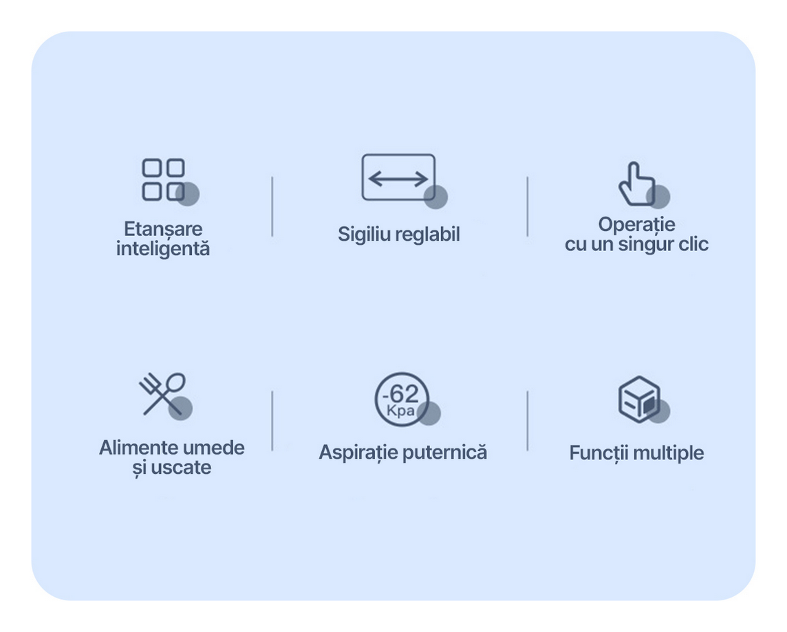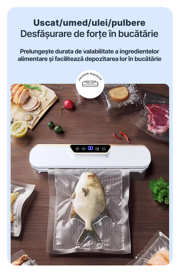 Aparatul este echipat cu o functie de sigilare in vid a marfurilor uscate, avand un grad de vid de -62 kPa si o etansare maxima de 25 cm. Aceasta capacitate permite ambalarea rapida si eficienta a ingredientelor, fie ca sunt bucati mari sau pachete mici.