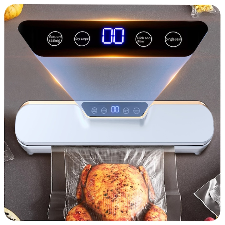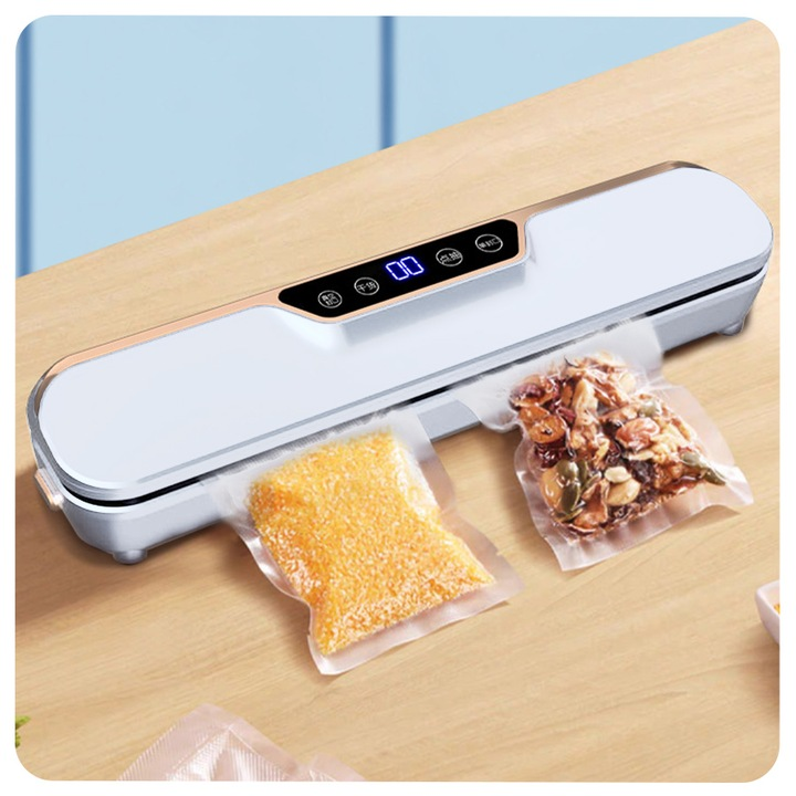 Aparat de vidat alimente, 120W, bara 25 cm, mod Uscat/Umed, Display LED, 10 pungi incluse, Alb