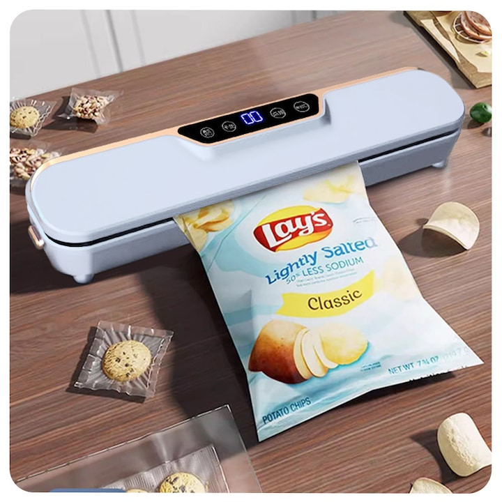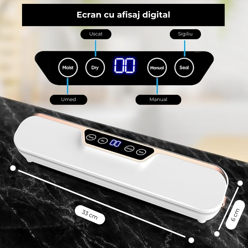 Aparatul de vidat este conceput pentru a fi intuitiv, avand un sistem de operare prin atingere. Datorita butonului de blocare si a tastelor sensibile, sigilarea alimentelor devine rapida si fara efort. Ecranul rezistent la apa asigura o utilizare fara griji, facand fiecare proces de vidare simplu si eficient